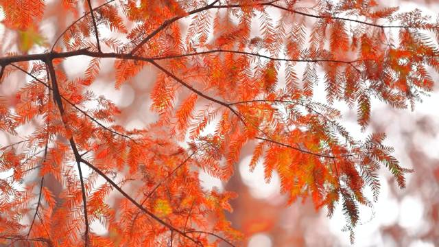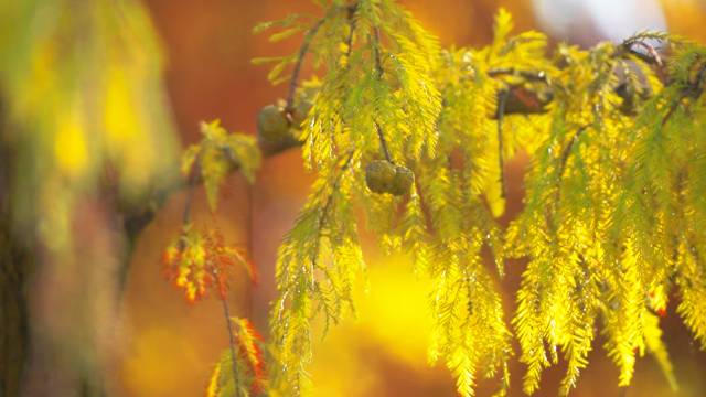 落羽杉的叶片在温度影响下呈现出丰富的颜色层次